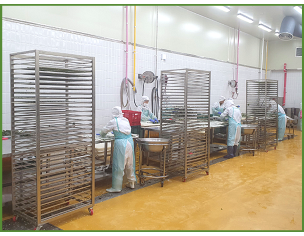 전통방식 그대로 생 다시마에 찹쌀풀을 손으로 하나하나 발라 건조시켜 다시마 자체의 풍미와 찹쌀의 고소함을 살려낸 제품으로 라이스페이퍼를 사용하는 타사제품과는 차별화한 제품입니다. 생산된 제품은 협력업체인 ㈜신안천사김으로 유통되어 완제품으로 생산됩니다. 코스트코, 쿠팡, 대상 등으로 납품되어지고 있습니다.